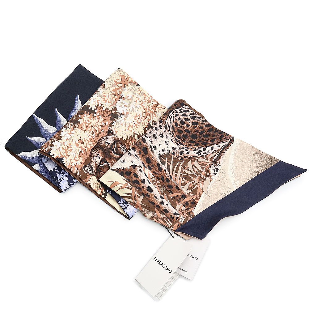 ■商品説明■【問い合わせ番号】200025139019【ブランド】Salvatore Ferragamo【参考定価】49,500円 【素材】 シルク100%【カラー】ブルー×ブラック×ブラウン【サイズ(cm)】約W160cmxH20cm