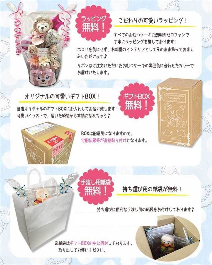 おむつケーキ専用のギフトボックスに包装し、祝い先へお届けしますとサプライズ間違いなし。ご注文者様とお届け先名が同じ場合は、ギフトボックスからおむつケーキを取り出し、手渡し用の紙袋に入れてお持ちいただけます。