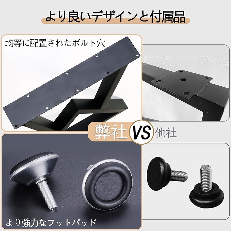 【変形しにくい&色褪せない】高品質の鉄材を使用し、素材が厚く、耐久性に優れた設計です。変形しにくく、長持ちします。表面には高温焼き付け塗装技術を採用しており、色合いが均一で色褪せしにくい仕上がりです。この耐久性と高品質の組み合わせが、信頼できる長持ちするテーブル脚をします。