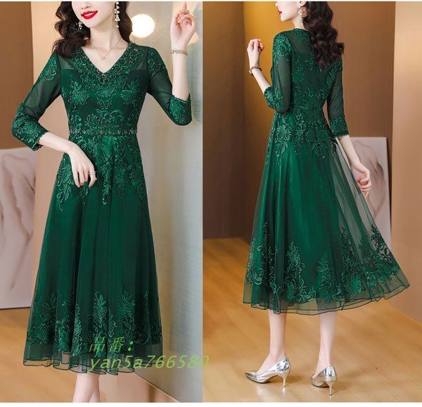 刺繍 パーティードレス レディース 総レース ワンピース ミモレ丈 グリーン 演奏会 ドレス 七分袖結婚式 二次会 yan 5 a 766580