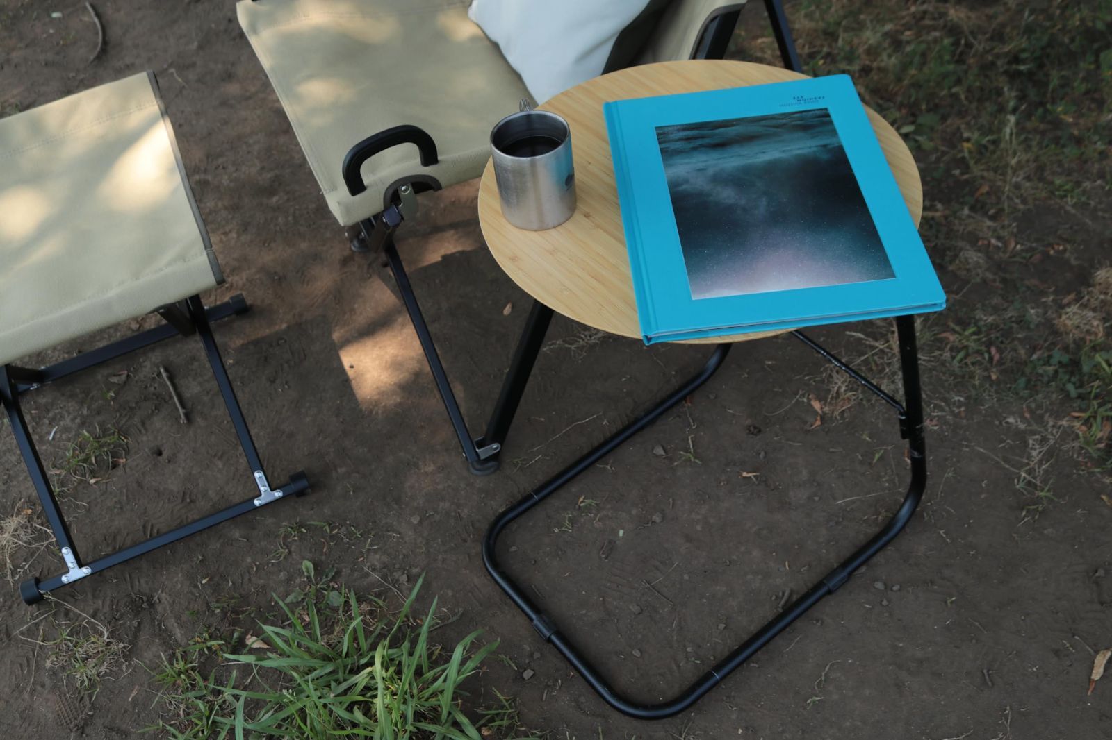 脚の下に入り込むカンチレバー構造、スリム収納で持ち運びも簡単。コンフォートローチェアに合わせた設計。脚部がチェア下を通り、リラックスしたままで手元にカップをもって来ることができます。ゴムコードで接続されているので設営、収納も簡単。