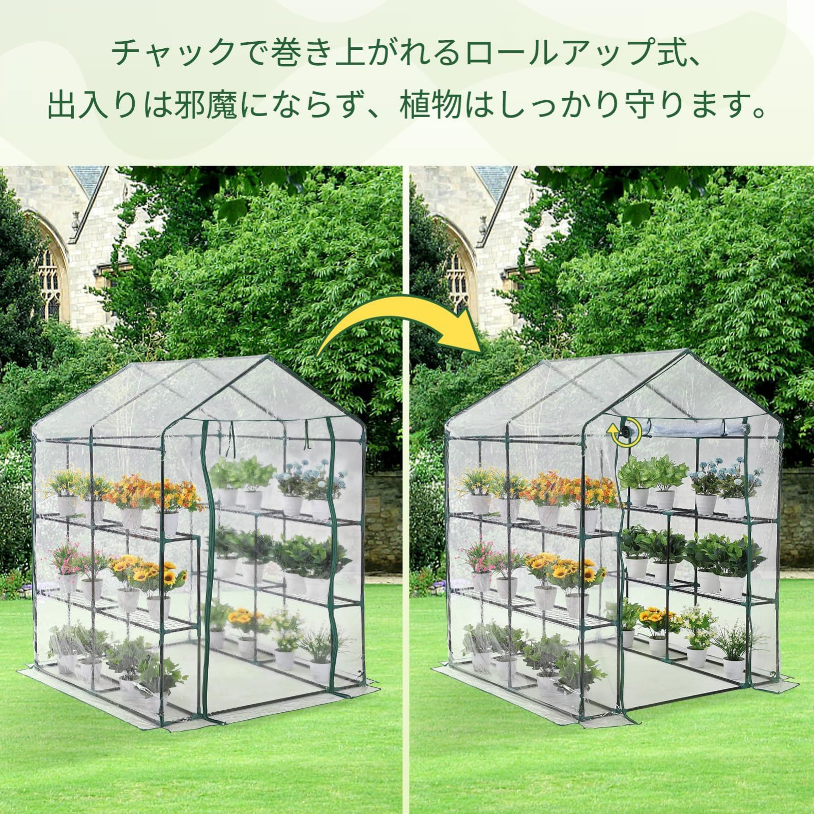 【巻き上げ式カバー】ファスナーでカバーを開閉でき、入り口を開けている時に邪魔にならないように紐でとめることが出来ます。換気や水やりがしやすいです。カバーを外せば、通常のラックとしても使用できます。