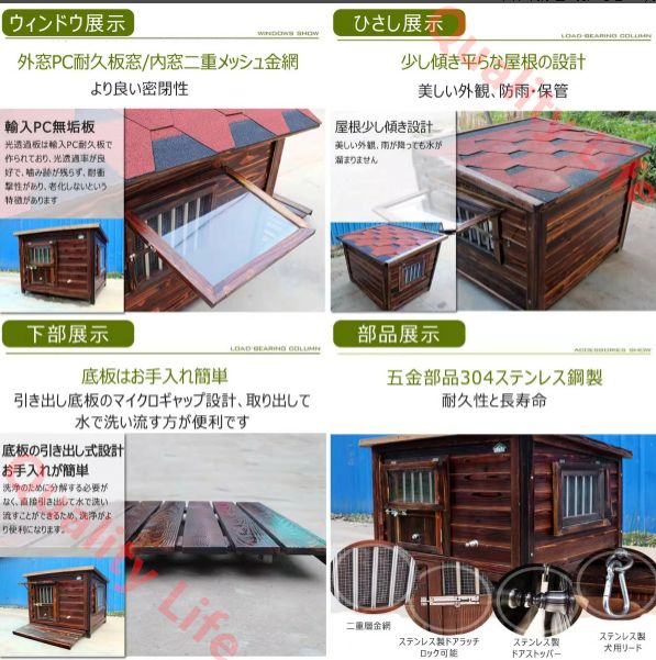 犬小屋 屋外用 無垢材 木製 犬舎 中型犬 大型犬 超大型犬 ドア付き 大型屋外犬小屋 犬用ハウス 引き出し式底板 通気性 暖かい 全天候型 日焼け対策 防風 雨除け 耐炭酸化と腐敗 安定性と耐久性 組立簡単 水洗い L
