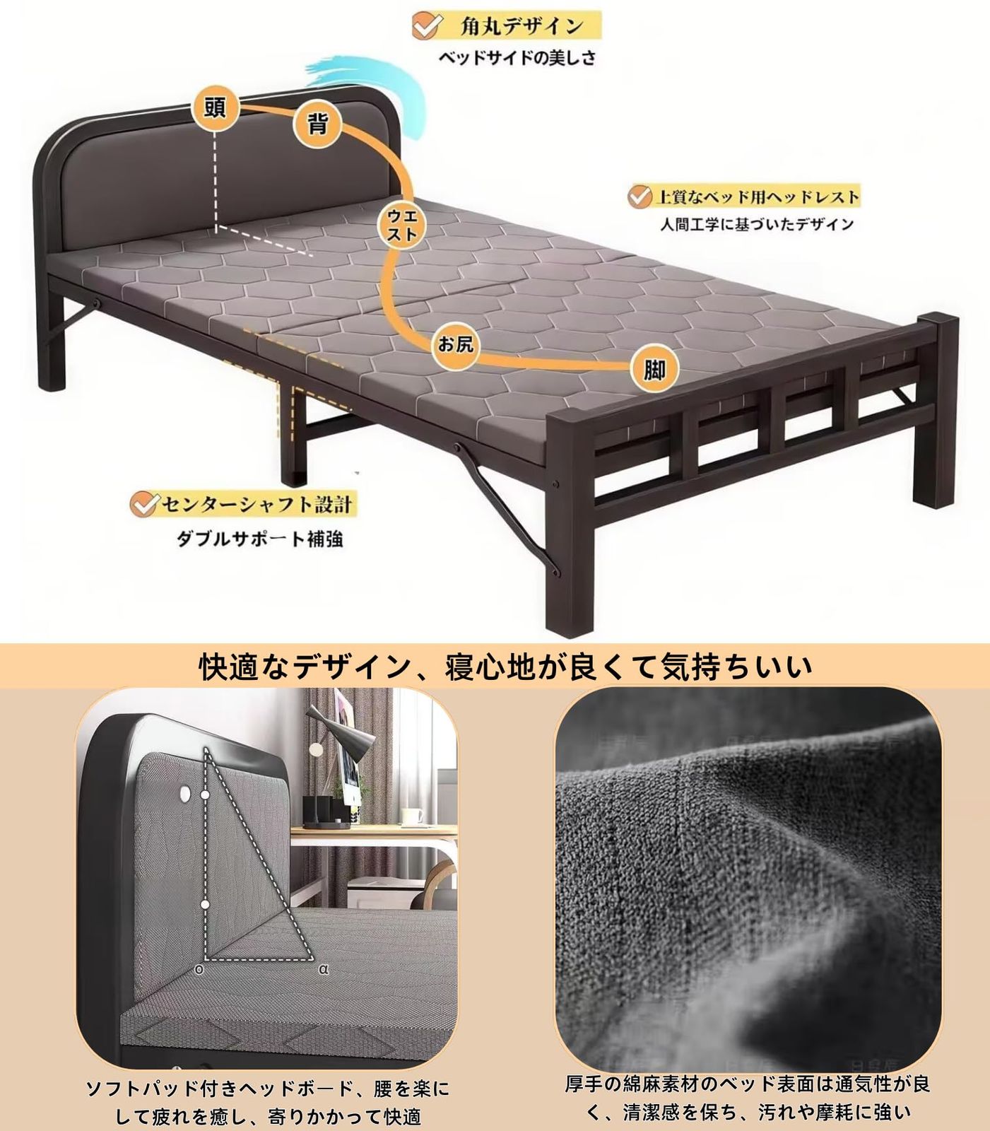 【折りたたみ式デザイン】シングルベッドは、簡単に折り畳むデザインを採用。使用時はフルサイズのベッドとして快適に寝れる一方、非使用時はコンパクトに折り畳むことが可能。折りたたんでおけば、場所を取らず、必要な時にすぐに利用できるため、効率的に空間を活用できます。