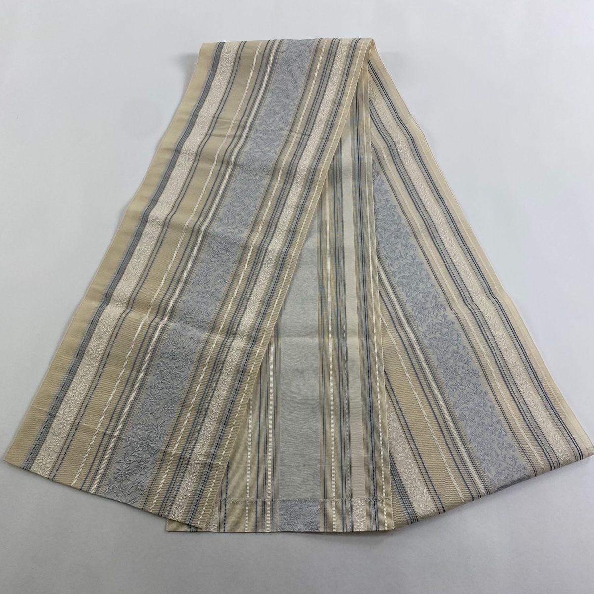 名古屋帯 秀品 八寸名古屋帯 夏帯 草花 縞 クリーム 正絹