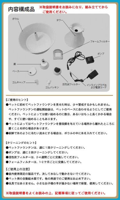 ペットにいつでも新鮮でろ過されたおいしい水を供給する、活性炭フィルター付きのペット用自動給水器です。高齢のペットのために、水飲み用ディッシュを高めに設定。複数の出口から流れ落ちる水により、複数のペットに対応することも可能。低電圧(12V)システムは、ポンプが簡単に外せるようインラインプラグになっています。