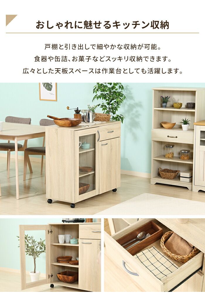 スッキリ片付く、キャスター付きキッチンカウンター。ガラス扉収納・引出・棚板付きでキッチン小物をまとめて整理。