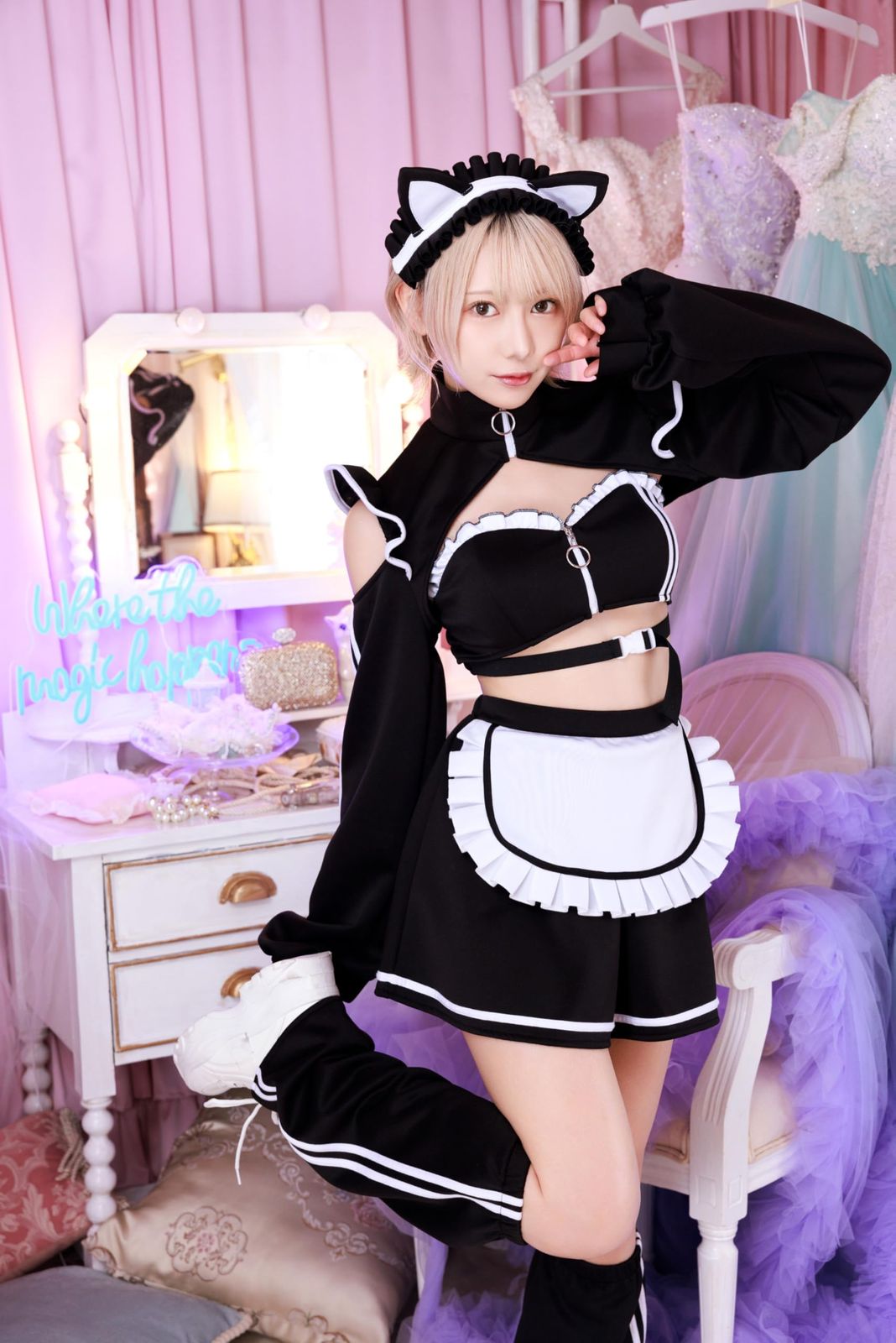 ライン使いやガチャベルトなどスポーティー要素に加え、萌え袖やヘッドドレスなどの可愛さもプラス。