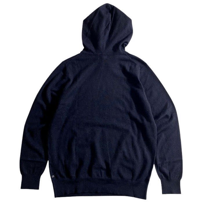 ポイントで添えたロゴが品良く映えるニットフーディ。
