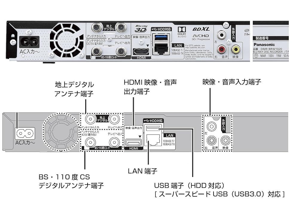 ✅ 製品仕様 型番:DMR-BRW1020|カラー:ブラック|HDD容量:1TB|チューナー数:2|対応メディア:BD-R/BD-RE/DVD-R/DVD-RW|外付けHDD:対応|出力端子:HDMI×1|サイズ:約430×41.5×179mm|重量:約2.1kg|発売年:2017年