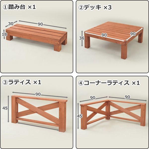 ●セット内容:デッキ3台、踏み台1台、ラティス1枚、コーナーラティス1枚(ラティス2枚分)
