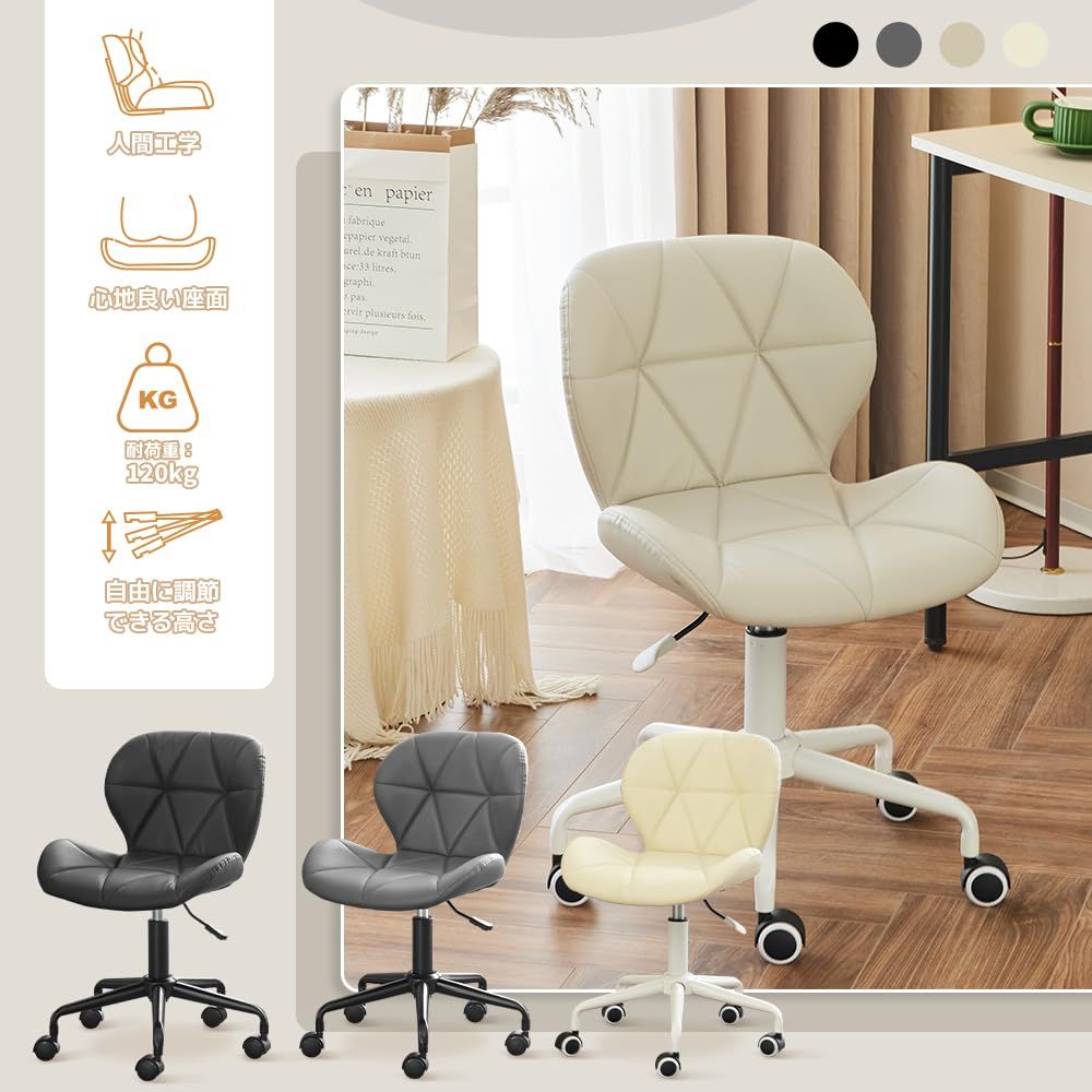 【高耐久性・お手入れカンタン】このオフィスチェアは主にPUレザー製で、汚れや磨耗に強いのが特徴です。何かをこぼしてもサッと拭けるので、お手入れカンタンです。レザーの手触りがお好きな方にもおすすめですよ。 【優しい曲線がフィット】座面と背もたれを一体化させたシームレスな設計。コロンとした形がかわいいオフィスチェアパンナ。目を引くキルティング加工がポイントです。丸みを帯びたデザインでコンパクトながらも、優しい曲線が身体にフィットします。色も単色に抑えることで、ミニマムで無駄のないデザインに仕上げました。背面から見ても柔らかい曲線が美しく、お部屋にスッと馴染むシンプルさが特徴です。