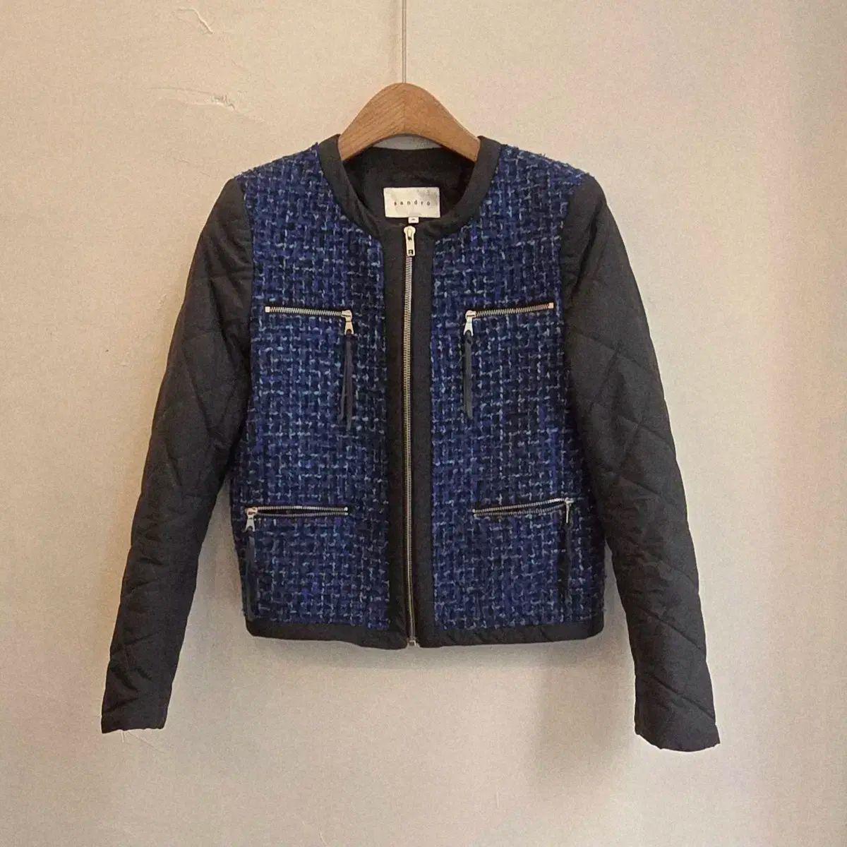 サンドロ ツイード キルティング バイカラー ジャケットです。独特な織りのツイード 素材とキルティング デザインが 際立ちます。前面 ジッパー デザインテープと ポケットで POINT を加えました。