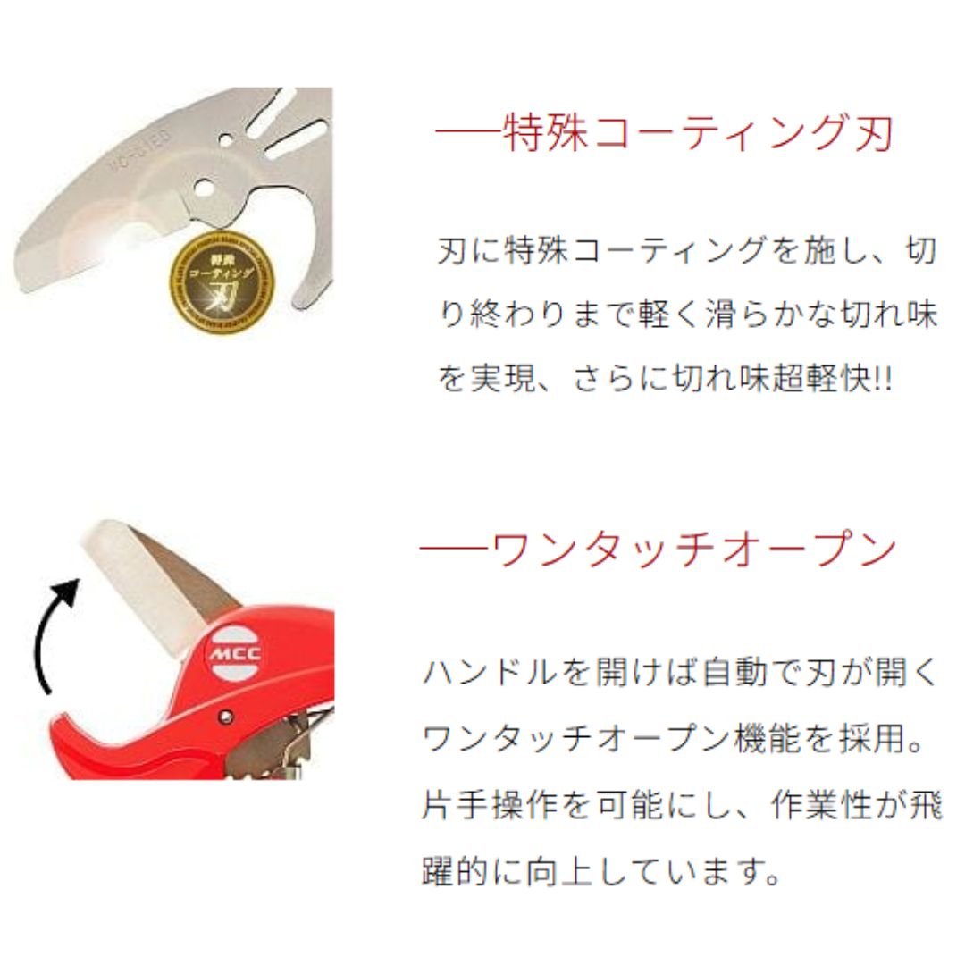 独自のワンタッチオープン機構により、硬質ポリ塩ビ管、ポリエチレン管を楽々切断可能です。
