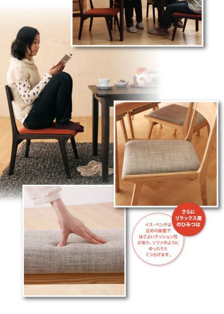 ※さらにリラックス度のひみつは・・・イスは広めの座面でほどよいクッション性があり、ソファのようにゆったりとくつろげます。