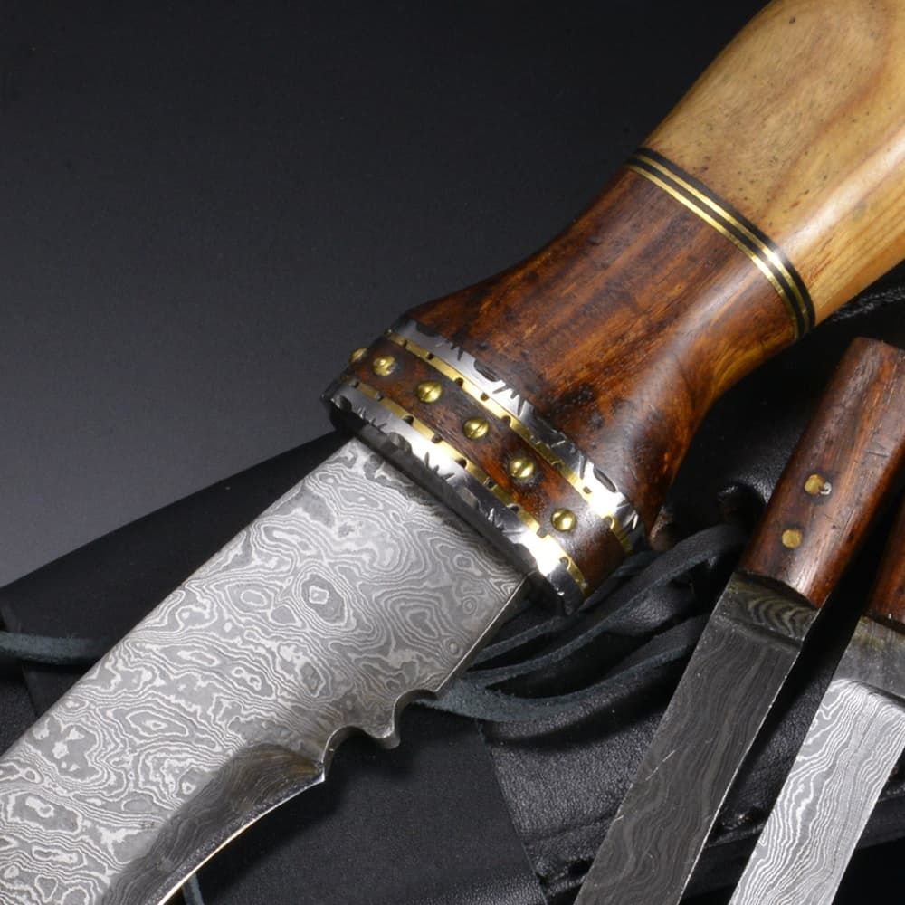 同じダマスカス鋼の小型ナイフが2本付属し、木の枝を削るなどの細かい作業も行うことができます。