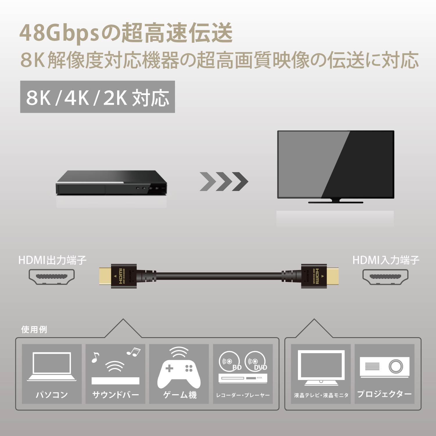 48Gbpsの8K映像高速伝送に対応しています。高い信頼性と機能性、ノイズ耐性を兼ね備えたウルトラハイスピードHDMI(R)ケーブルです。