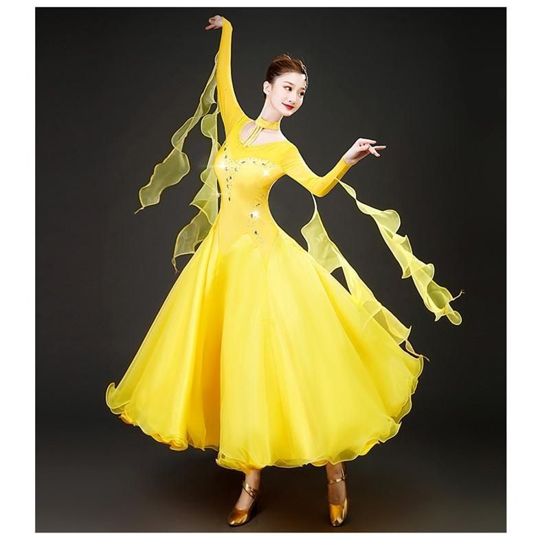 社交ダンスドレス 社交ダンス モダンドレス イエロー 大きいサイズ 長袖 大きい裾 スタンダードドレス