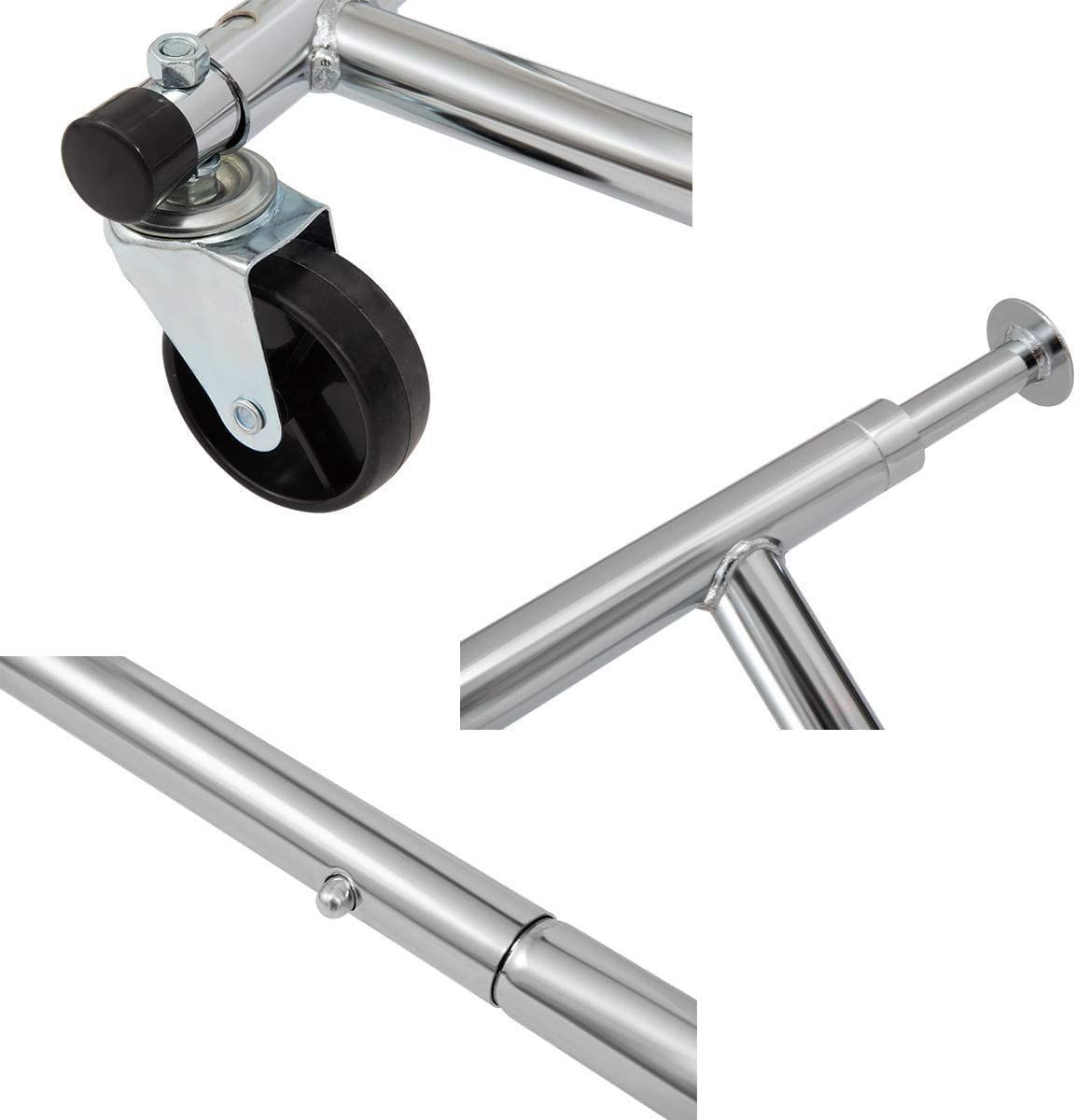 業務用の頑丈な洋服ラック:ストラットの全金属クロムメッキ管全体と上部レールの偏平チューブ、パイプのつなぎ目が全て溶接で作られており、サビに強く、耐久性も抜群!耐荷重が 110キロの重量(均等配置)に揺れたり変形したりすることなく耐えられます。