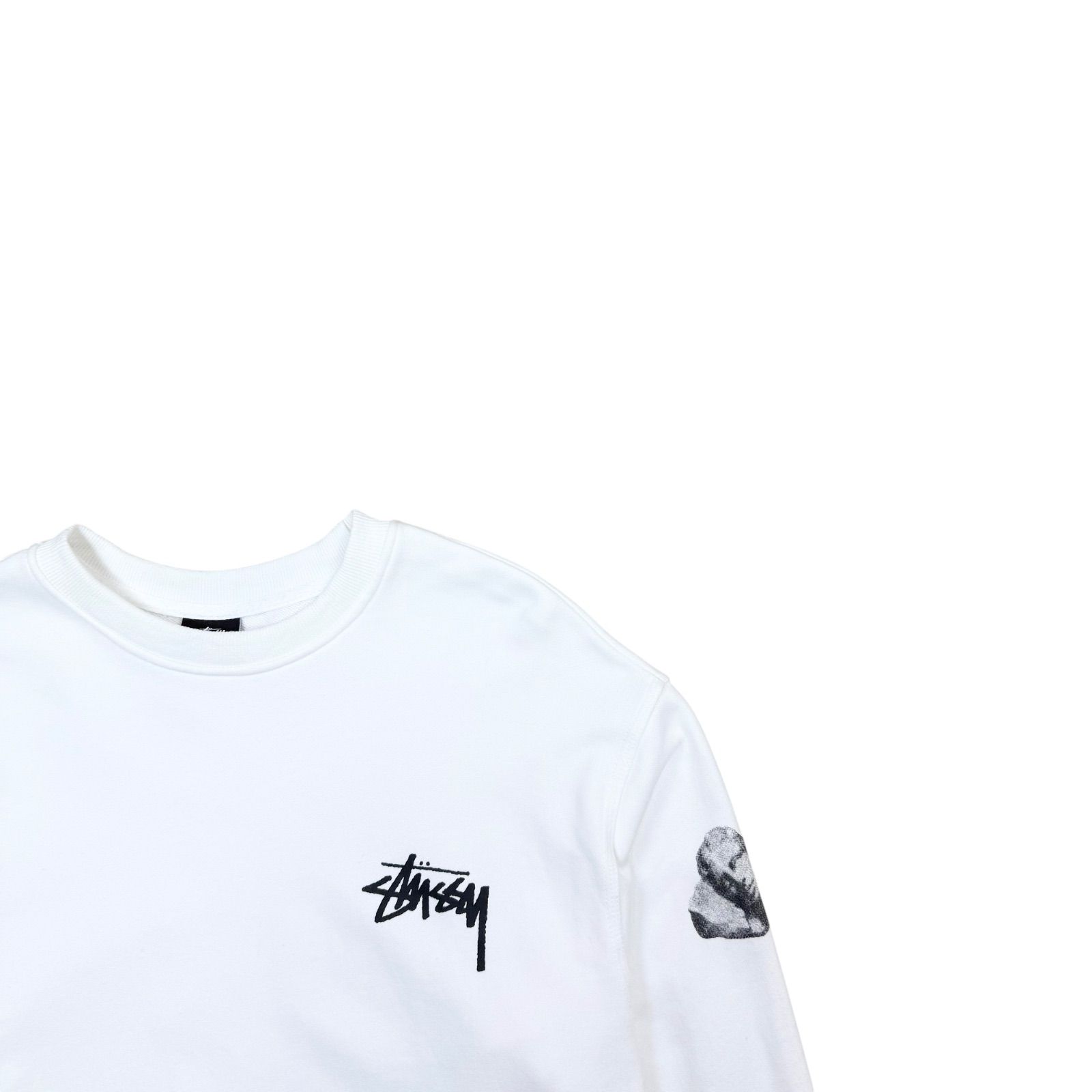 両袖にはストーン調のフェイスグラフィックと、クラシカルなエンジェルのプリントが施され、ストリートとアートを掛け合わせたステューシーらしい存在感ある仕上がり。