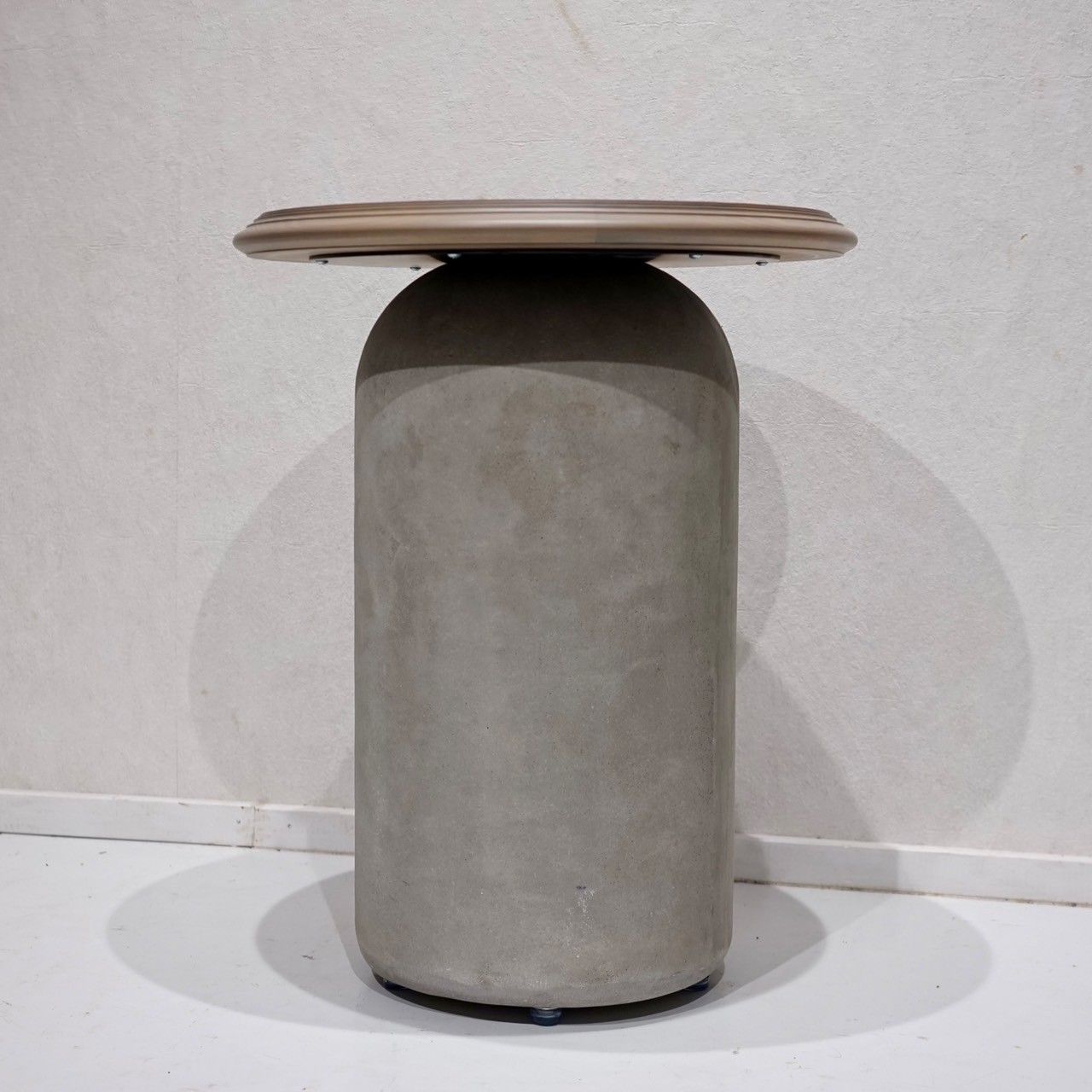 天板は木製(やわらかな木目仕上げ・面取りエッジ)で手触りがよく、土台はコンクリート製の円柱フォルム。