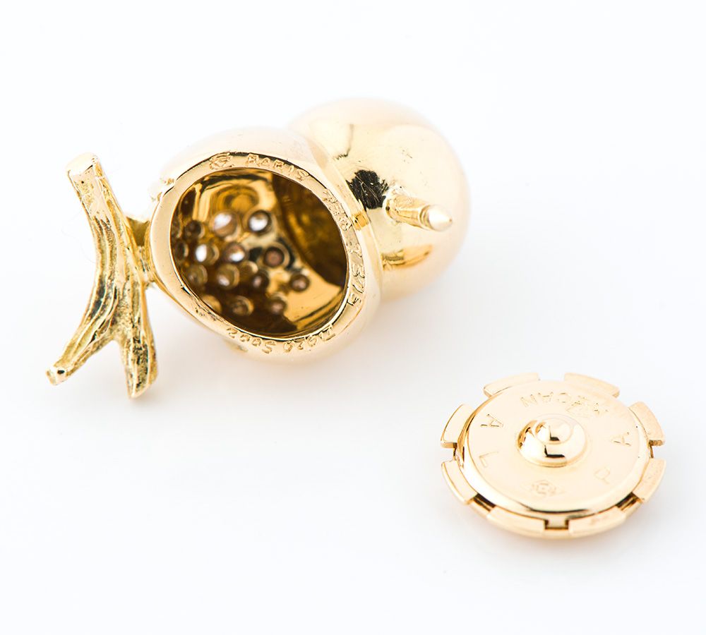 少し首を傾けた姿が愛らしい、幸福のシンボルフクロウをモチーフにしたブローチ。お腹の部分にはメレダイヤモンドがパヴェセッティングされ存在をアピール、カボションカット ブルーサファイアのつぶらな瞳がとてもキュートです。幹のテクスチャーから細やかで丁寧な仕事ぶりが伝わるチャーミングなジュエリーです。※製造元を示すと思われるロゴ刻印有