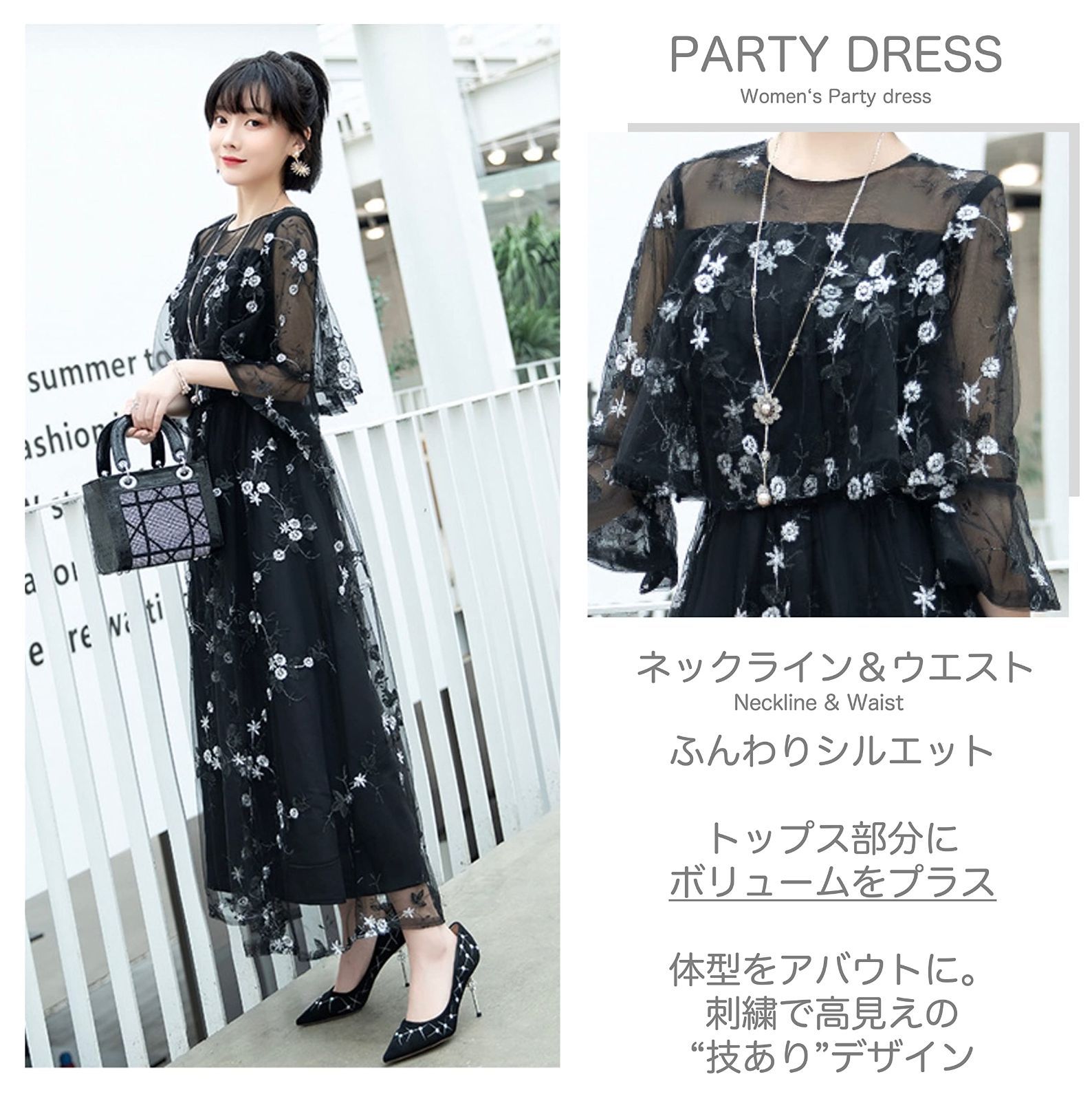 [大人かわいいデザイン] 上品なロング丈のおしゃれなパーティーワンピース。 全体に施された花柄刺繍が新鮮でヘルシーな印象に。 高見え効果にも期待。トップスと袖部分には、シースルーで華やかな席にもぴったりな大人フェミニンなディテール。バスト周りには、ふんわりレースを被せ体型をアバウトに。さり気なく体型カバーを叶え、優しい印象を後押ししてくれる技ありデザイン。きちんと感は欲しいけど、地味見えはイヤ、という方にぴったりなオケージョンドレス。選べるカラーも嬉しい。ナチュラルで大人上品なデザインでお呼ばれワンピースとしても◎結局、行き着くのは長めの着丈と人とかぶらない美シルエット。きちんと見えと品格を備えた人気のフォーマルドレスです♪