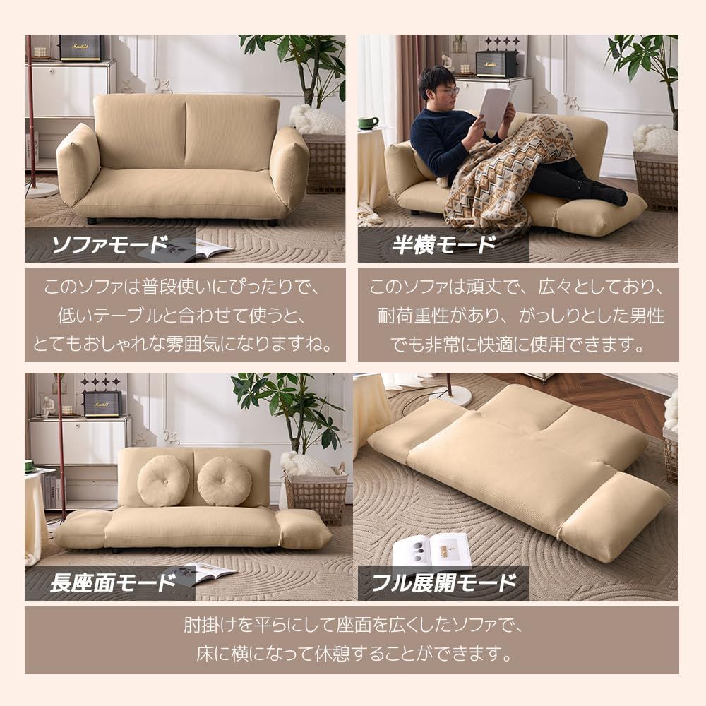 *「背面」6段階ギア リラックスする時の姿勢は人それぞれ。 このソファの背もたれは調節ができる6段階のリクライニングギアが付いているので、自分の好みの角度に細かく調節することができます。 *「肘掛け」6段階ギア 左右の肘掛は6段階のリクライニングが可能です。両側をフラットにしてベッドにしたり、片方だけを倒してちょっと休む際の枕にしたりと、気分に合わせた使い方ができます。 *解放感をもたらすロータイプ ソファの座高高は21cmと空間を広く見せてくれるロータイプになっています。 解放感をプラスしつつも、しっかりと座ることができる賢い設計はワンルームなどのお部屋にもおすすめです。 クッション折りたたみの状態では座椅子として。 ローテーブルと合わせてゆったりコーヒータイムなどに。 *カウチスタイル 座面を広げると座面に奥行きが出てロングサイズに。 足を伸ばしてゆったりくつろぎたい時に最適なカウチスタイル。 *フラットスタイル 背もたれのクッション部を広げ、背もたれを倒せばフラットスタイルに。 お昼寝やごろんとくつろぎたい時におすすめ。 *自在なリクライニング 背もたれは6段階リクライニング可能。 読書、お昼寝、来客時など、多彩なシチュエーションそれぞれに合った形に調節できる。 自分だけのお好みの角度調節で、オリジナルのくつろぎスペースを作れる。 *身体をやさしく包む肉厚クッション 座面と背もたれのクッション部分には、ウレタンフォームを採用。ふっくらとした仕上がりで底付き感がなく、体を優しく包み込むような座り心地。 またウレタンはわたのクッションに比べてへたりにくく、心地よさが長持ち。 *コンパクト梱包&簡易組立 梱包がコンパクトになり、玄関からの搬入がしやすい。 *二つクッション付き 付属の同色クッションは、腰に当てるのにちょうど良い、細長い形です。 枕にも使えますのでリラックスタイムにご利用ください。 *コンパクト収納 普段しまっておきたい人に嬉しいコンパクト収納。 お掃除の時やカビ対策に陰干ししたい時に立てておくこともできます。 *座面の厚みは約21cm。 たっぷりのクッション材が入っているので、ふわふわの座りごこちです。 *こだわりの三層構造 ボリュームのあるチップウレタン、ピュアウレタン、肌に近い上層のシリコンフィルの三層構造で底付き感のない快適な座り心地を実現しました。さらに、一番下にSバネを入れることで、しっかりと座面を支える構造になっています。 *セーフティーサポートで安定感UP 背もたれを倒して使う際、背もたれには大きな圧力がかかります。これを支えるため、背もたれにしっかりとしたセーフティーサポートを付けました。セーフティーサポートが圧力を受け止めることで、ソファがバランスを崩して傾くのを防止します。