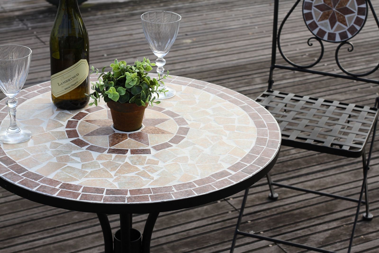 素焼き調のモザイク柄がお庭やバルコニーに彩りを演出、地面に直接設置してもウッドデッキにも雰囲気がピッタリです。