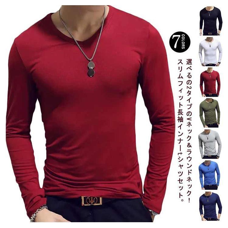 選べるの2タイプのVネック&ラウンドネック!スリムフィット長袖インナーtシャツセット。