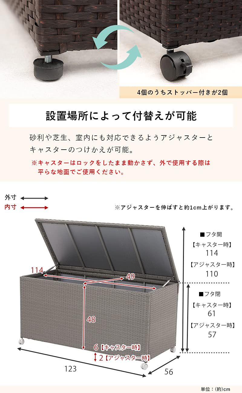 【安心の商品仕様】:底板耐荷重は約40kgと重量感のあるものにも対応可能。本体は濡れても水をはじくのでタオルで拭くだけでOK。フタ裏は水を通しにくいプラスチックのカバー付き。日よけにもなります。