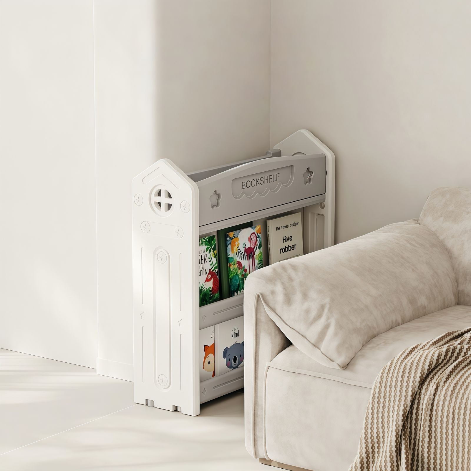 ワイドなホワイトボードデザインで自由に絵を描くことができる。本棚が付いているので、お子様の読書習慣を自然に育みます。