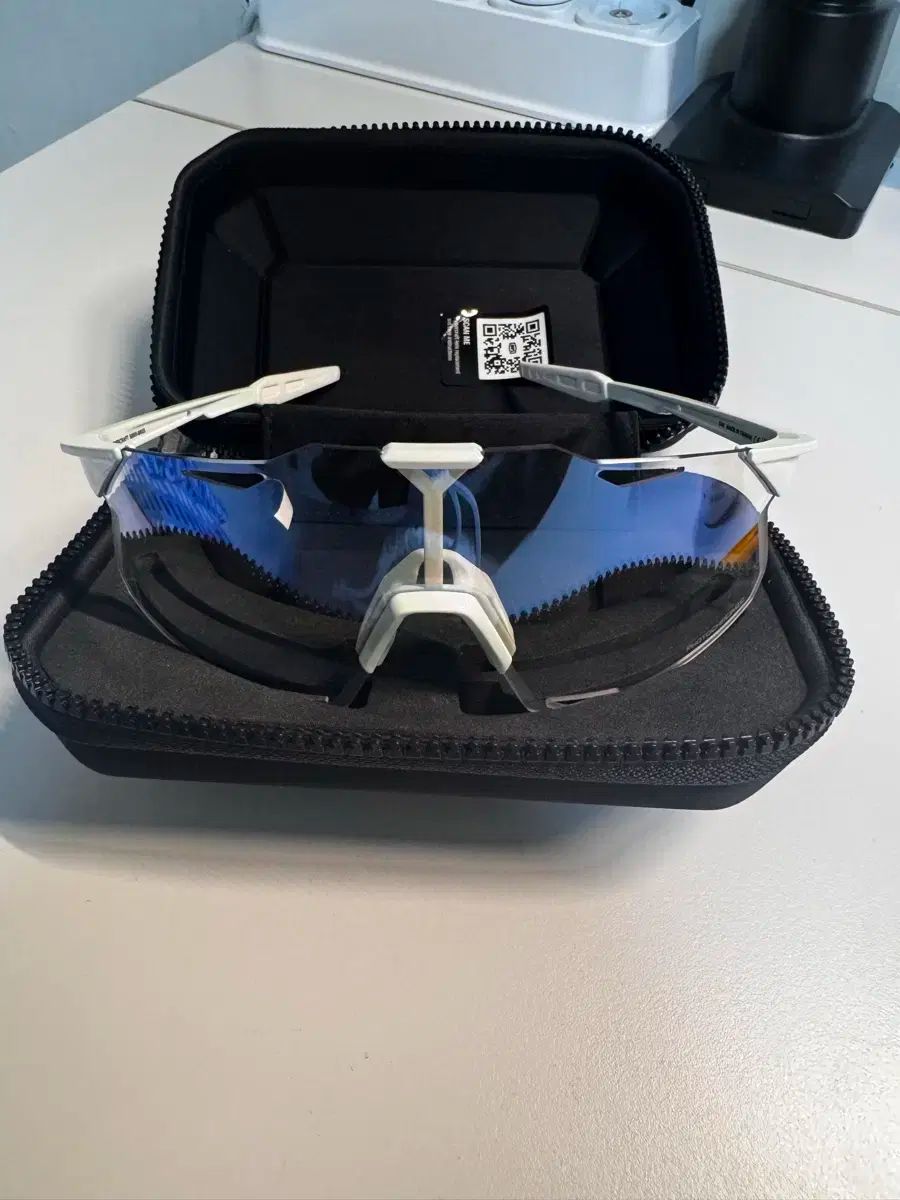白 フレームに 青 レンズが 涼しい 感じを 与えます。