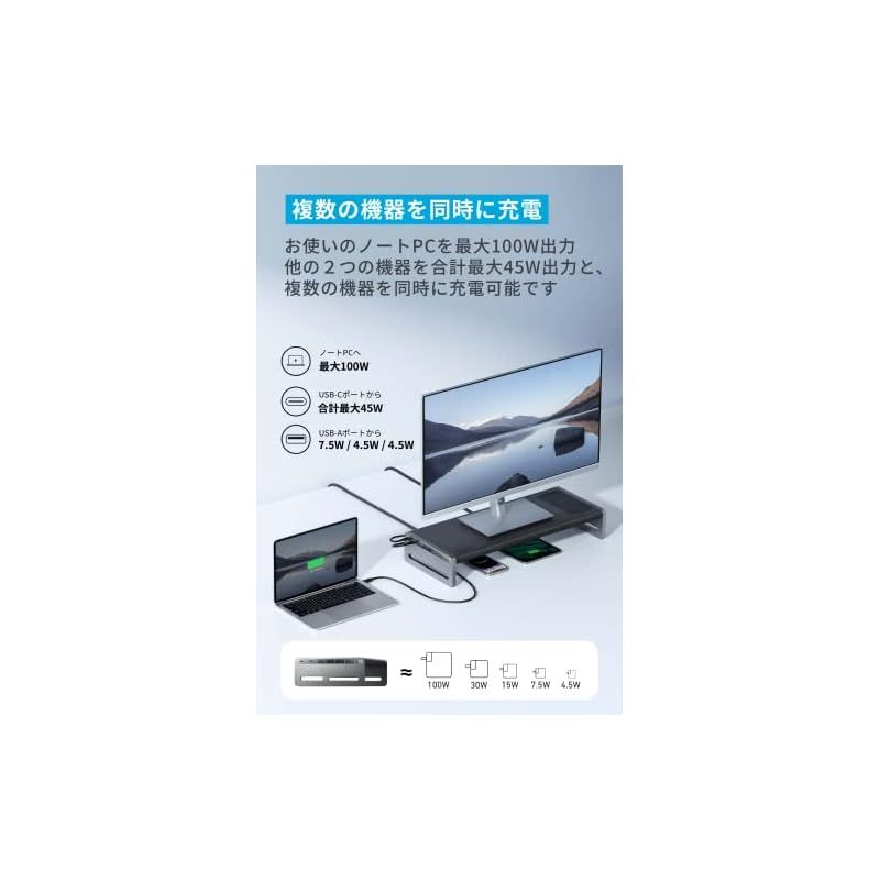 複数の機器を同時に充電:ノートPCを最大100Wで充電可能なUSB-Cアップストリームポートに加え、USB PDに対応したUSB-Cポート (合計45W) 2つ、USB-Aポート (1 × 7.5W, 2 × 4.5W) 3つ、スマートフォン用のワイヤレス充電パッド (最大10W)を搭載しており、複数の機器を同時に充電可能です。