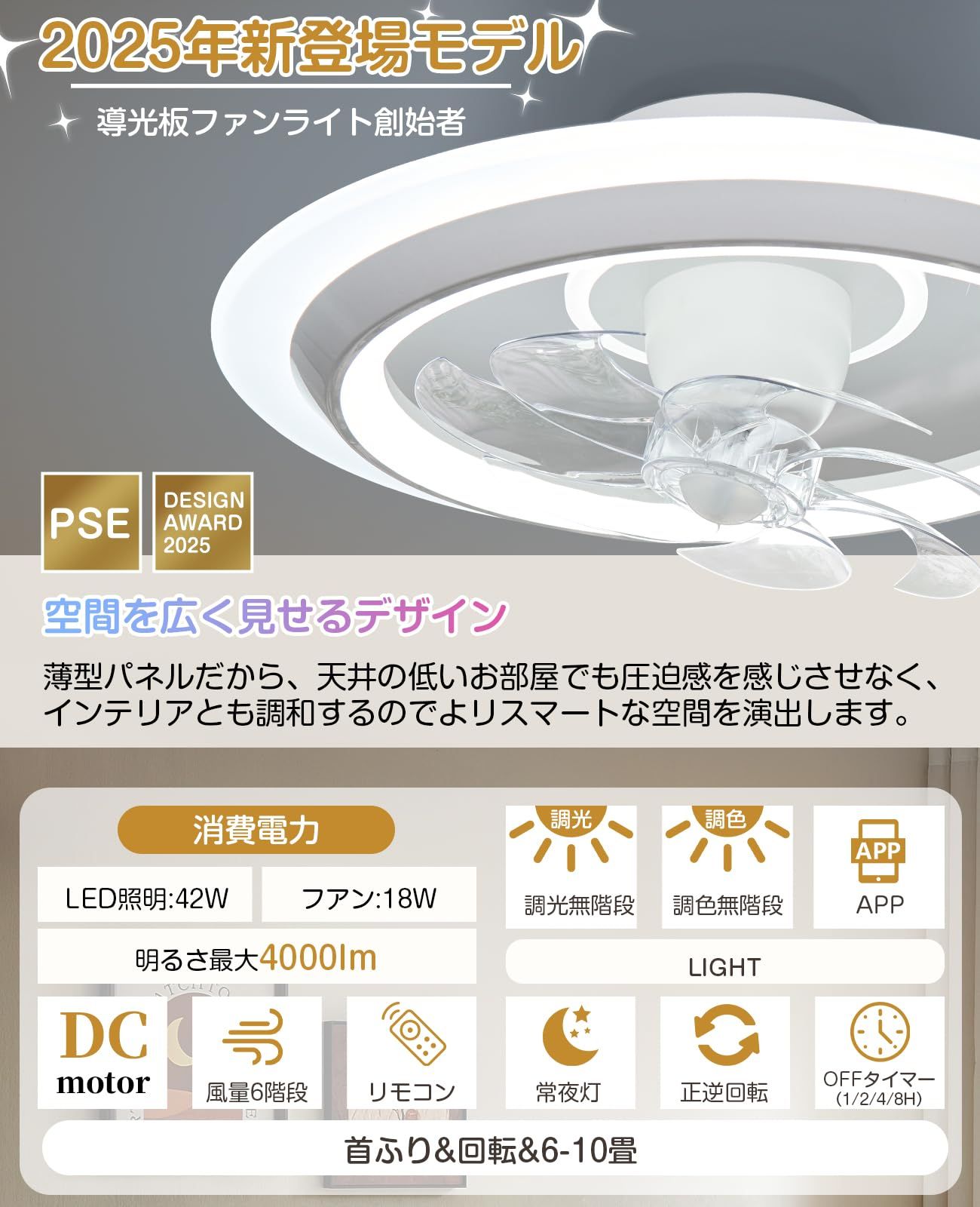 ONRIU シーリングファンライト led 導光板 ファン付き照明 4 000 LM 150 W相当 8 10畳 サーキュレーター 無階段調色調光 DCモーター 正逆回転 常夜灯モード 風量6段階調節 昼光色 昼白色 電球色 メモリ タイマー機能 APP 2