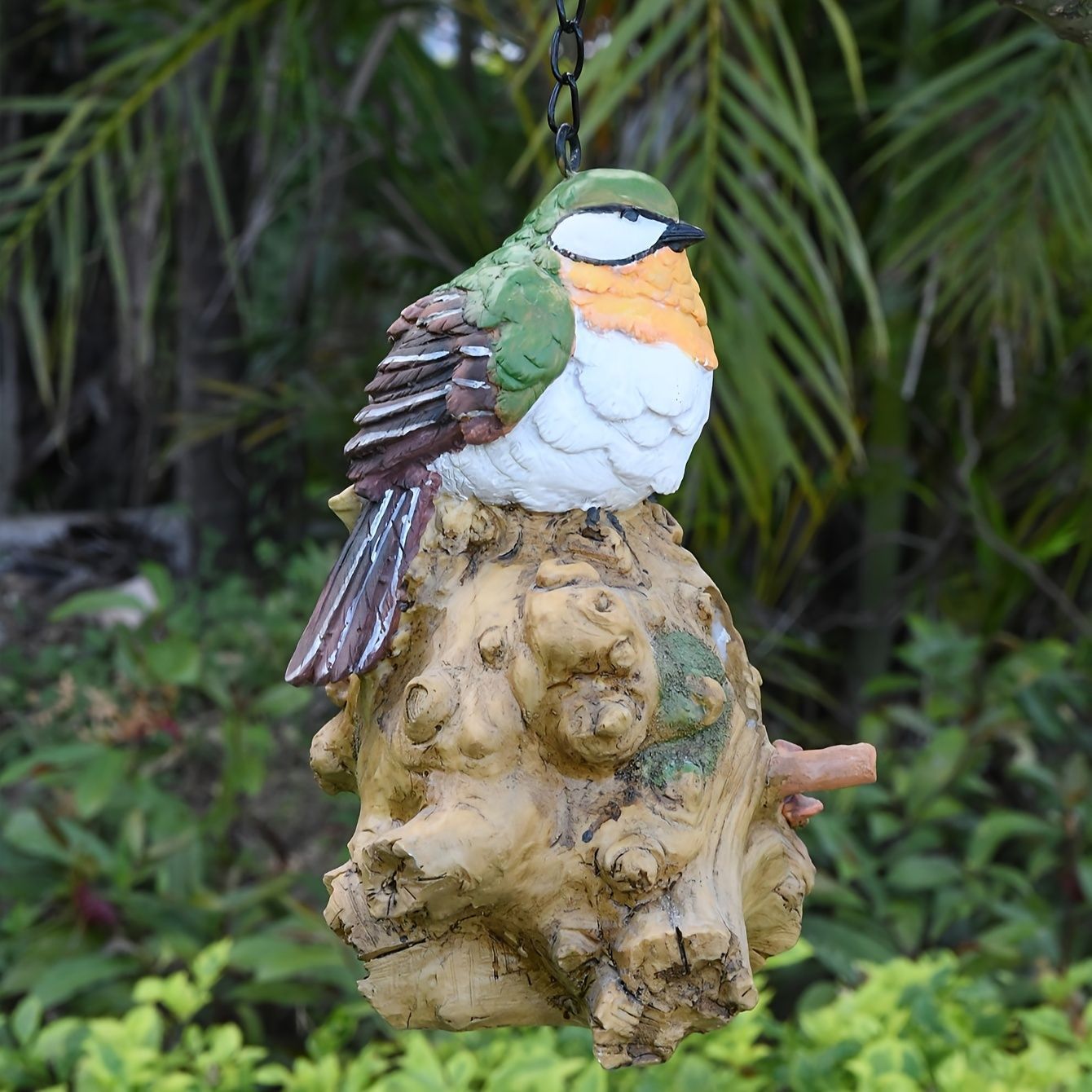 美しい庭園を演出する、かわいらしい鳥の巣箱です。樹脂製のデザインで、切り株に止まっている小鳥の姿が愛らしく、庭やテラスにぴったりのインテリアアイテム。ぶら下げて吊り下げることで、自然な風合いを楽しむことができ、鳥たちの休憩所としても最適です。