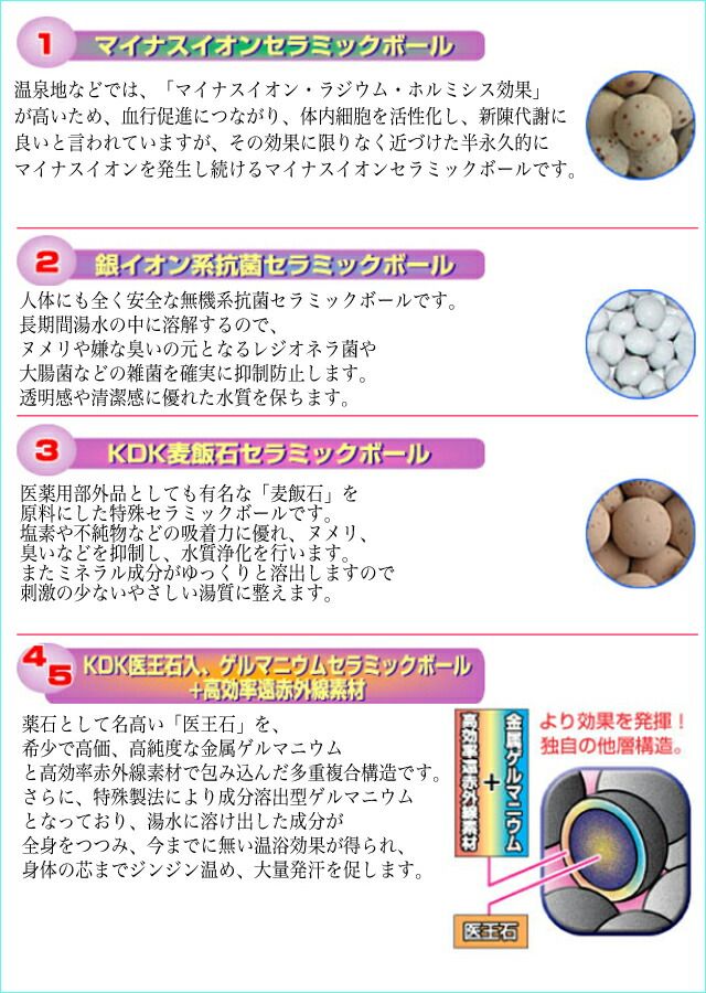 ■付属品 ●温浴ケース(マイナスイオンセラミックボール、銀イオン系抗菌セラミックボール、KDK麦飯石セラミックボール、KDK医王石入り金属ゲルマニウム・高効率遠赤外線素材・医王石セラミックボール)