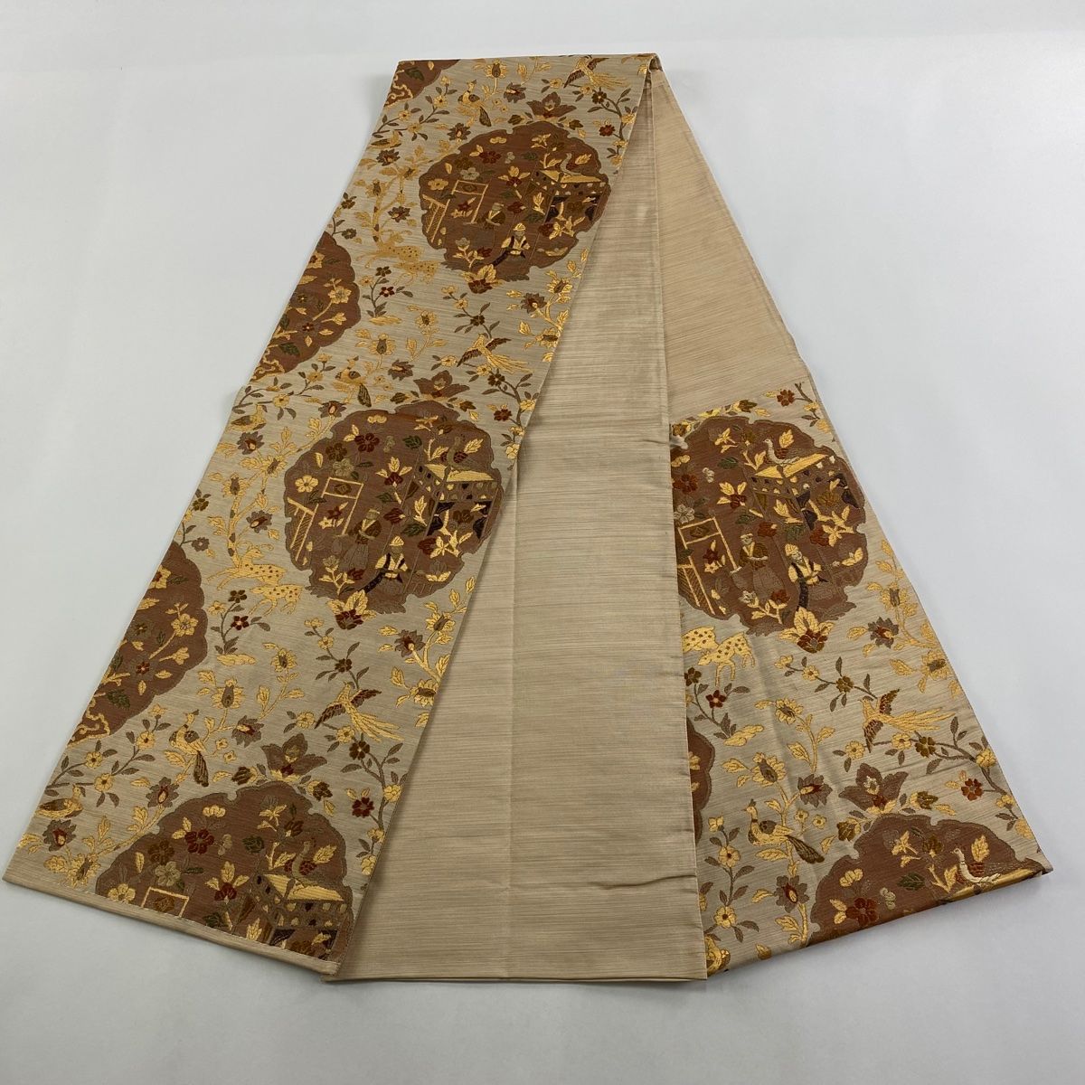 袋帯 秀品 人物 花鳥 金糸 刺繍 薄茶色 六通 正絹