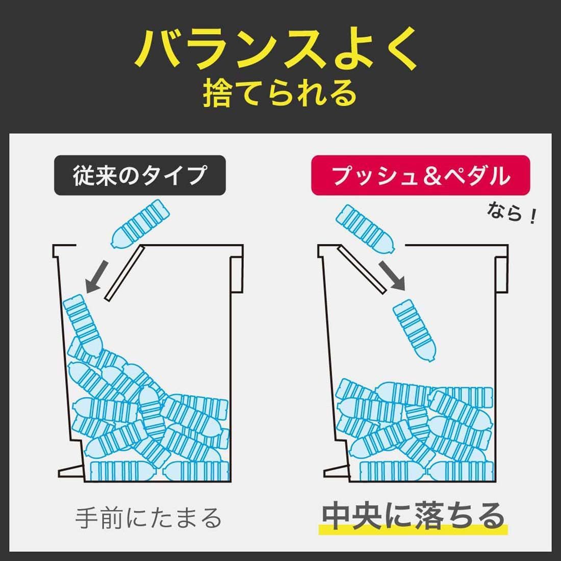 ゴミが平均にたくさん入る、こだわりのプッシュフタの開き方