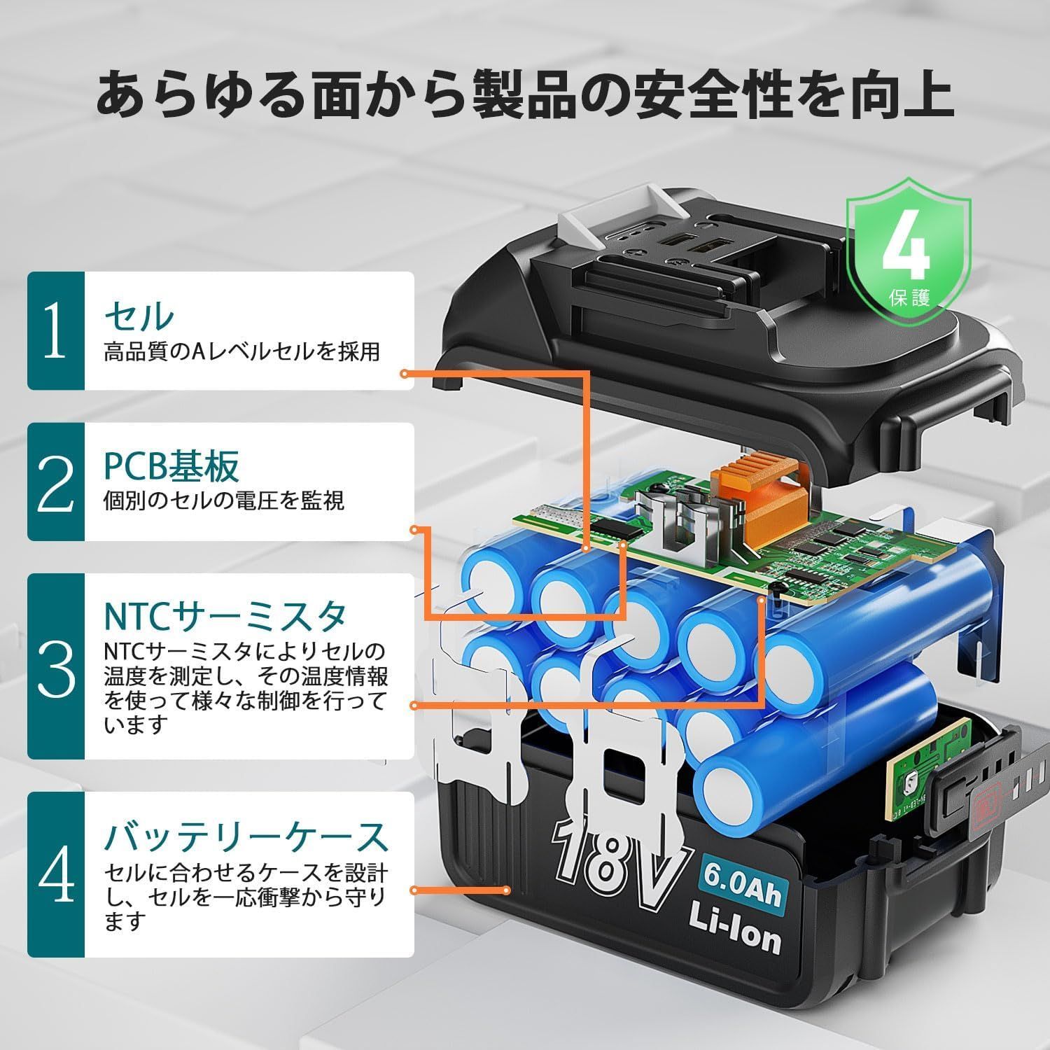 【6000mAh大容量・長時間作業 】容量6000mAhで、40~60分連続動作できて、長時間の作業をサポートし、充電回数を減らす、作業効率を十分に向上させることができます。充電時間は約55分間です。(※ご注意:電動工具お作業のスピードとパワーにより、差がありますので、ご承知おきください)