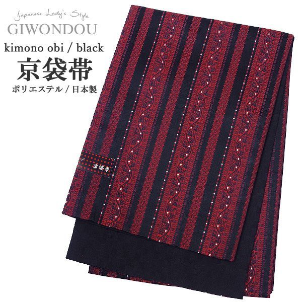 京袋帯 お太鼓 一重太鼓 黒色 赤色 縞 アラベスク 唐草 リバーシブル ポリエステル 仕立て上がり モダン 粋 女性 帯 着物 20代 30代 40代 50代 60代 70代 kyo-r 7-gu 2