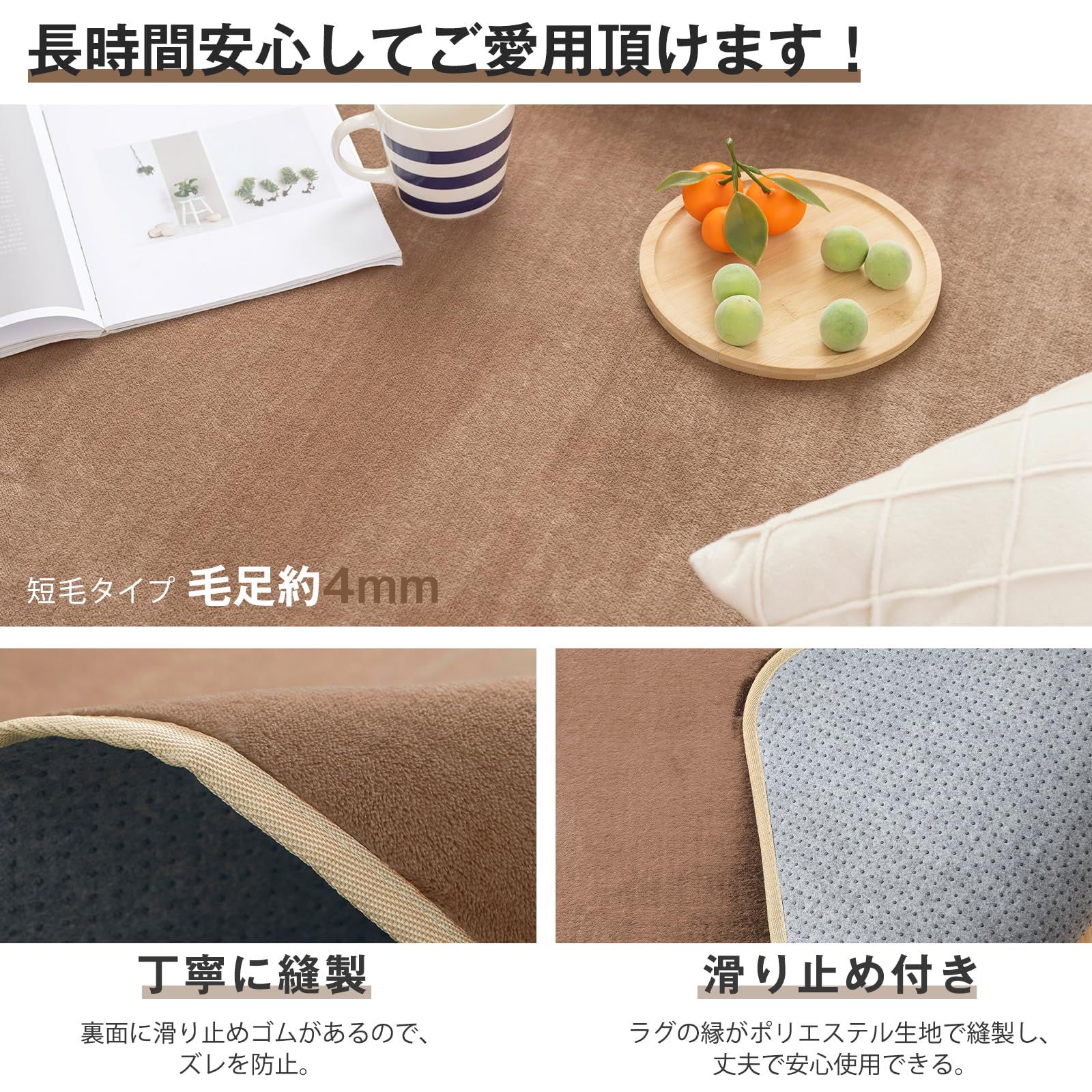 ?【抗菌防臭・滑り止め付】防ダニ・抗菌・防臭、 ノンスリップ加工。裏面に滑り止めゴムがあるので、お掃除の時に滑る心配はまったくない!お子さまやお年寄りのいる家庭でも安全安心に使用できます。ラグの縁がポリエステル生地で丁寧に縫製し、丈夫で長時間使用できます。