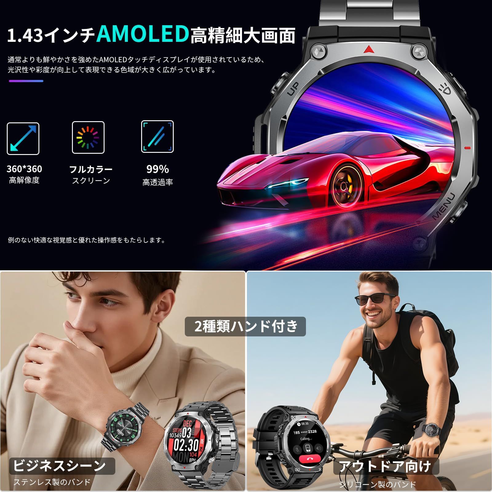 【1.43インチAMOLEDタッチディスプレイ&軍用規格スマートウォッチ】 このスマートウォッチは高精細で美しい色を表現できる1.43インチAMOLEDタッチディスプレイを搭載し、視認性に優れた466*466高解像度大画面を採用され、画質がより鮮明になり、より高精度な大画面で文字を表示されます。例のない快適な視覚感と優れた操作感をもたらします。 更に、このスポーツウォッチは軍用級の材料を採用され、高温・低温・衝撃・防塵防水などの軍事規格認証をクリアして、あらゆる過酷な条件や試練にも耐えることができて、最も信頼できる仲間であります。※お風呂、サウナ、海水、温泉などのご利用はお控えください。