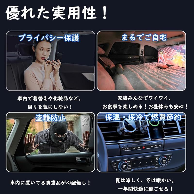 【幅広い用途】家族、ビーチ、夏のプール、車での旅行、カーキャンプ、その他のレジャーに適しています。車中泊に最適な商品となっております。疲れて眠くなったら、そのまま車内で睡眠や着替えをすることで、外からの視線を効果的に遮り、プライバシーを守り、車内を快適なプライベート空間とします。