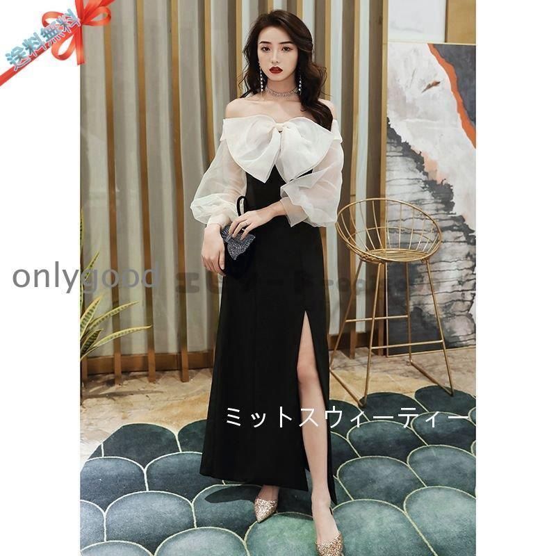 パーティードレス イブニングドレス カクテルドレス 演奏会 ドレス ロングドレス 黒 長袖 発表会 二次会 オフショルダー スリット リ