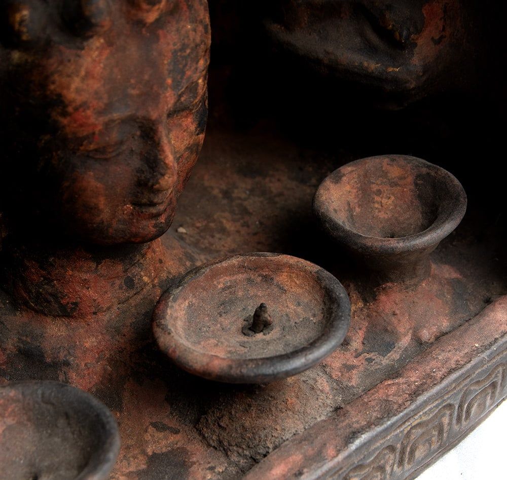 チベット密教の厨子型をした仏像です。真ん中に一柱、横に2柱、合計3柱が掘られています。厨子とは、仏像・仏舎利・教典・位牌などを中に安置するための収納具のことを指します。
