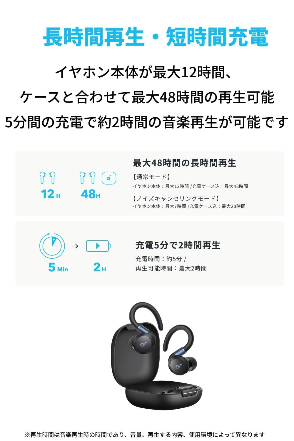 長時間再生・短時間充電:イヤホン本体が満充電の状態で最大12時間、付属の充電ケースを合わせて使えば最大48時間の音楽再生が可能です。また、5分間の充電で約2時間の音楽再生が可能です。