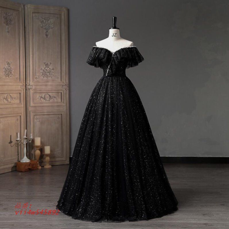 イブニングドレス 黒 オフショルダー 発表会ドレス 演奏会ドレス ブラック ラインストーン パーティードレス 結婚式 ロングドレス 二次会ドレス 感 パール vii 4 w 545892