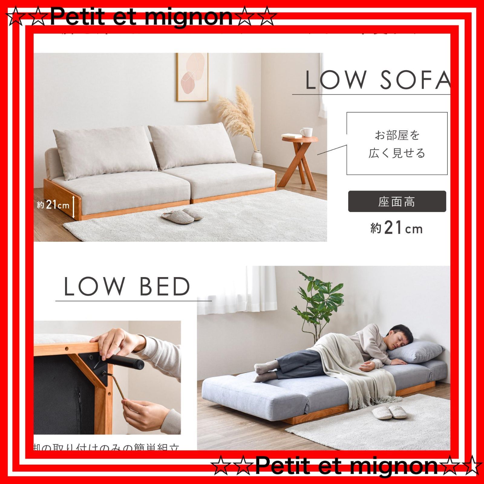 【深く沈み込まない弾力感でしっかりと身体を支える】座面部はほど良い固さで、しっかりとした座り心地がお好みの方におすすめです。座面高は立ち座りがしやすい高さで、身体をしっかりと包み込む背面クッション付きです。お昼寝や読書などに最適でおうち時間をお楽しみいただけます。【脚を外せばローソファやローベッドに早変わり】座面の低いロータイプソファにすれば、お部屋の空間に余裕が生まれお部屋がすっきりとした印象に。また、背もたれを倒してローベッドとしても使用いただけます。※この商品はセパレートタイプのため、ソファ同士のズレが発生する場合がございます。予めご了承ください。