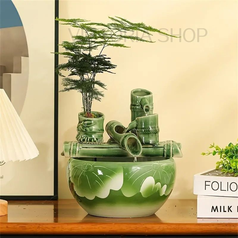 置物 オブジェ セラミック ファウンテン 竹のデザイン 和風 オーナメント グリーン 光沢 お洒落 和モダン 旅館 ロビー 玄関 インテリア ホームデコ